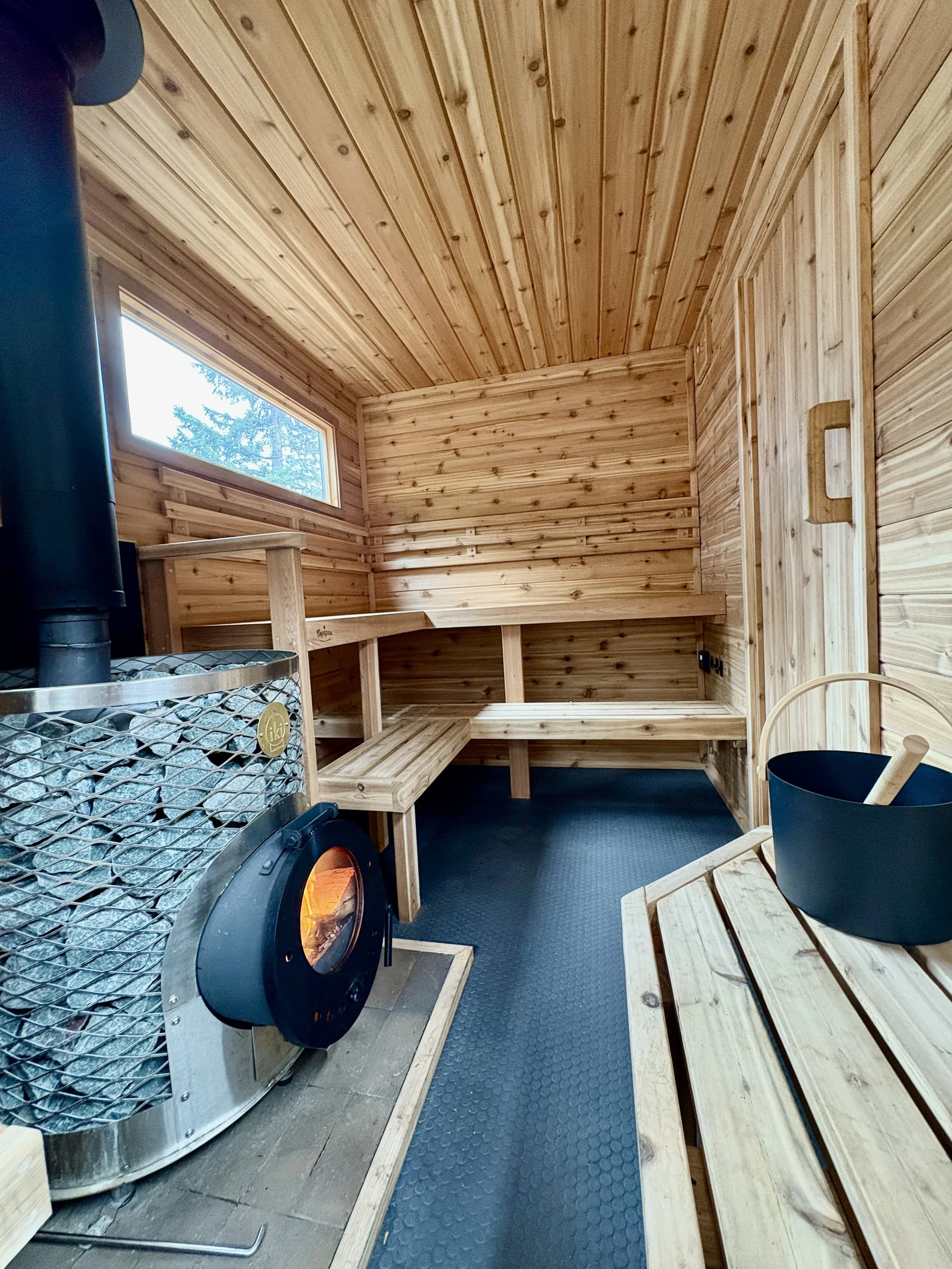 Our beautifully crafted 20 ft Γ 9 ft cedar sanctuary, fueled by a Finnish wood-fired stove, creates space to slow down, reconnect, and restore where forest meets shoreline